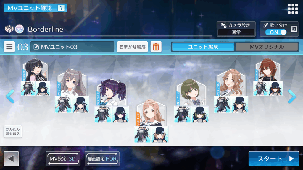 指定キャラクターで編成した場合、MVの本来の歌唱パートから位置が入れ替わってもキャラボイスが追従する仕組みなのだが、この機能を使えばライブではめったに見られないパート替えが簡単に見られるというのである。神である。